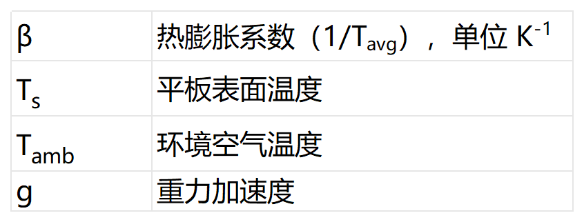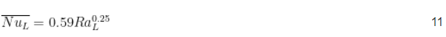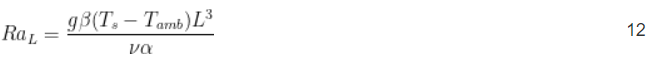 対流熱抵抗は、空気の動きによってプレートの表面から熱が奪われる度合いです。自然対流を伴う加熱された垂直プレートの場合、無次元ヌッセルト数 (Nu) [2] は式 11 から導出されます。ヌッセルト数は、対流計算で使用される無次元変数です。