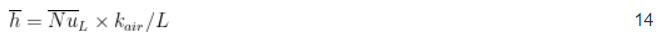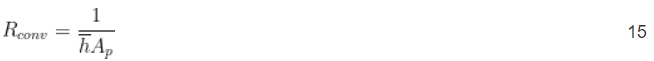 平均対流係数は、式 14 によって計算されます。対流熱抵抗 R conv は、プレート表面積 A p と、式 15 によって計算される平均対流係数の関数です。プレートの表面積には、プレートの厚さによって生じる面積が含まれないことに注意してください。プレートの表面積は、表裏の表面積よりもはるかに小さいためです。