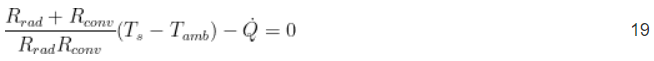 R の値は、プレート表面温度 T rad 、R conv 、および R sp sの関数であるため、直接解くことはできません。熱源によって生成された熱がすべて平面ラジエーターによって放散されると仮定すると、エネルギー バランス方程式は方程式 19 になります。