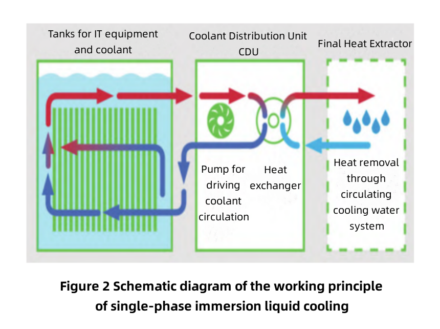 浸漬液体冷却では、IT 機器を冷却剤に直接浸し、冷却剤に依存して機器から発生する熱を吸収します。冷却液が循環熱放散の過程で相変化を受けるかどうかに応じて、単相浸漬液体冷却と二相浸漬液体冷却に分けることができます。